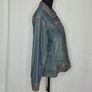 Add a touch of edgy style to your wardrobe with this vintage-inspired denim zip-front jacket. This jacket features intricate Southwestern Aztec-style embroidery that enhances its timeless denim design. Distressed denim gives it a modern, worn-in look, making it the perfect layering piece for both casual and dressed-up outfits.