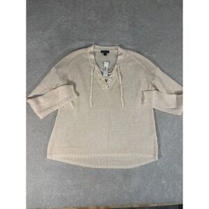 The J CREW sweater is a stylish and versatile piece perfect for any occasion, featuring a classic V-neck design and a nautical fisherman theme. Made from light and breathable linen, this ivory sweater has a solid pattern with crochet accents and a lace-up detail, adding a touch of texture to the open-knit fabric. With long sleeves and a regular fit, this pullover sweater is ideal for the summer and spring seasons, offering comfort and style effortlessly. The J.CREW brand ensures quality and durability, making this a must-have addition to any woman's wardrobe.
