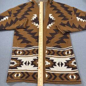 SWEATER CARDIGAN WOMEN LARGE Aztec Geometric Hooded Brown White POCKET