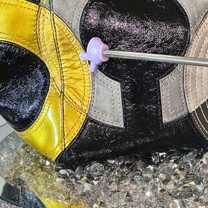 * Design: Features large, stitched "Op Art" inlaid "C" logos in a combination of black, gold, silver, and gray.