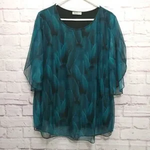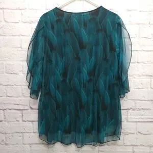 Sese Code Teal Feather Sheer Mesh Tunic Blouse Sz XL Flowy Flutter Boho Mature