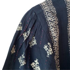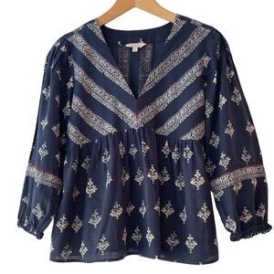 Lucky Brand 3/4 sleeve baby doll boho top, V-neck, navy blue red accents Sz XS