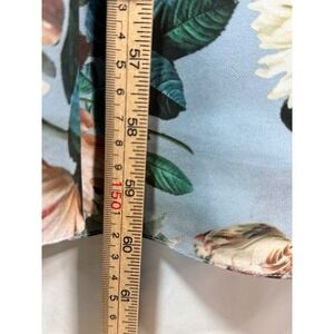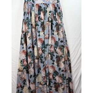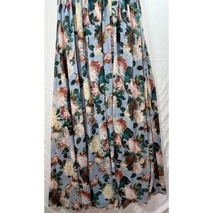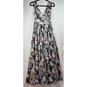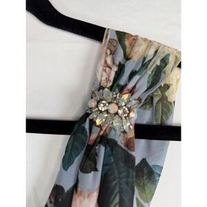Elegant floor-length maxi dress features an all-over botanical floral print in shades of dusty blue, cream, and mauve. Designed with a flattering deep V-neckline and a sleeveless silhouette, the shoulders are accented with sparkling crystal-embellished brooches for a touch of glamour. The flowing pleated skirt creates a sophisticated movement, making it an ideal choice for weddings, formal galas, or special evening events. NWT