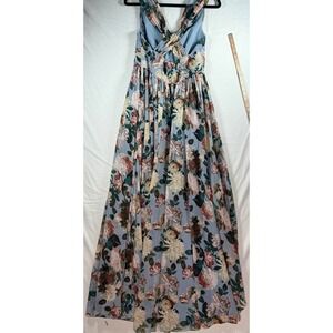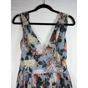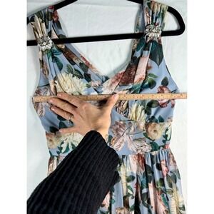 Floral V-Neck Maxi Dress Sleeveless Crystal Brooch Dusty Blue Formal NWT sz 4
