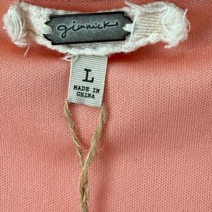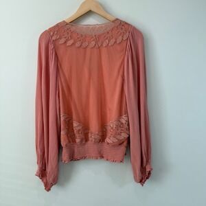 BKE Gimmicks Lace Inset Top Size L Peach Embroidered Mesh Smocked Waist Cuffs Boho Preppy