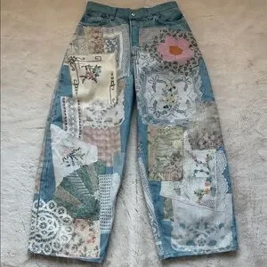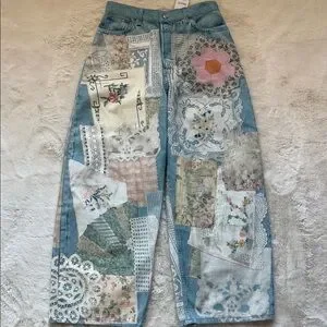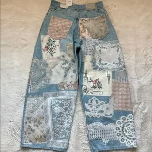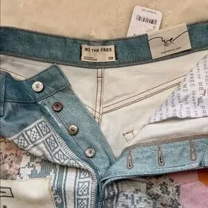 We The Free Illusions Printed Relaxed Jeans. The size is 29. Here are some measurements: inseam is 27", rise is about 12.5", side to side on waist is 14.5". One of a kind digitally printed design made to mimic patchwork and distressing. Button closure, barrel-inspired legs, 5-pocket styling. 100% cotton. This unique pair is sure to turn heads with every wear! Brand new with tags!