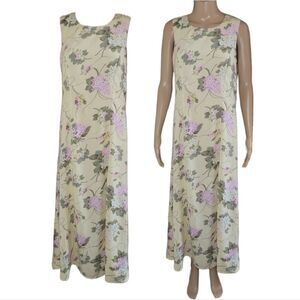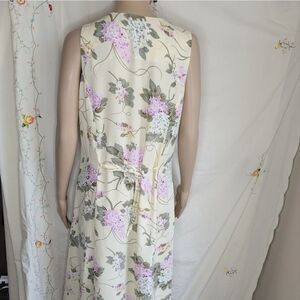 light yellow with lilac flowers, and green print sleeveless maxi length dress. Ties in back.