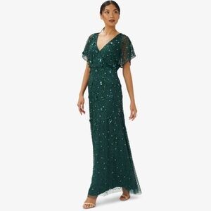 New with tag. The dress you need when you want maximum glamour and glitz. Intricate handsewn 3D floral beadwork blooms allover our floor-sweeping gown designed in our iconic (and figure-flattering) blouson silhouette. We especially love the sheer illusion flutter sleeves and clean surplice neckline. The long skirt is finished with gentle pleats for added movement and sway on the dance floor. Sleek back zip closure.