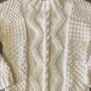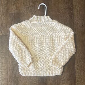 This charming cream cable knit sweater is perfect for keeping your little one warm and stylish. Its classic design makes it a versatile addition to any wardrobe. This sweater would be perfect for a boy or a girl. It would fit a two or three-year-old no problem probably with some room. I'm not sure of what the material is whether it's a wool or yarn.