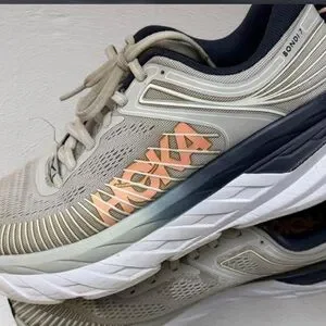 Hoka shoes with a sleek gray and peach design. Ideal for running.