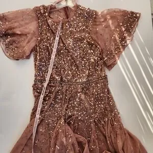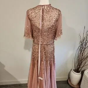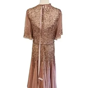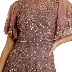 Dazzle in this rose sequin dress. Perfect for special occasions. Features elegant sleeves.