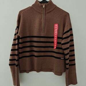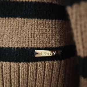 Chic DKNY sweater with bold black stripes. Features a cozy turtleneck design.