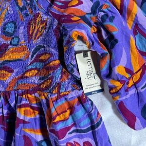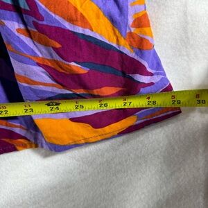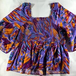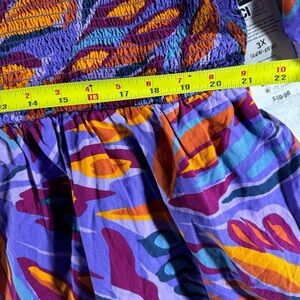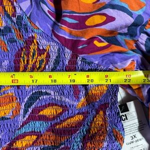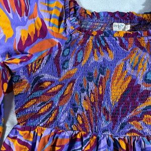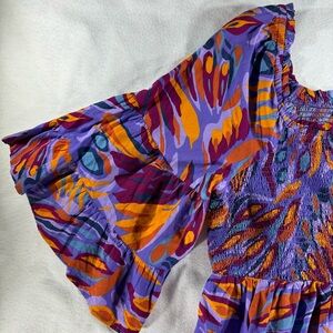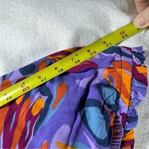 Elevate your style with this vibrant purple and orange top. Perfect for any occasion, this top combines comfort with a bold design. Stretch bust/waist to contour to your body with a flare out ruffle base.