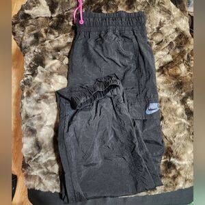 Stylish black joggers with a vibrant pink drawstring. Features a multicolor Nike logo. Inside mesh keeps you dry as you exercise. Perfect for everyday comfort. Size m, no rips or stains!