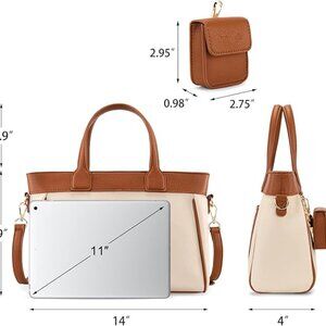 Womens tote handbag measures 14"L * 4"W * 9"H (5.9"Drop). With 1 main compartment, 1 zip pocket, 2 open pockets and 1 back pocket.