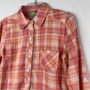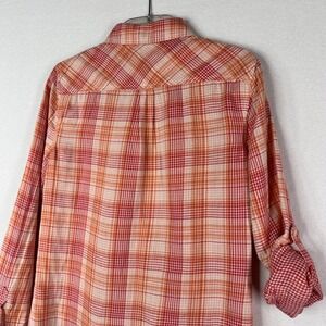 C&C California Blouse XS Button Front Roll Tab Orange Pink Plaid Lightweight NEW