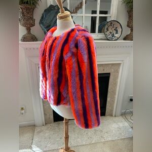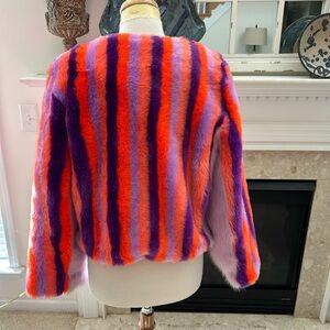 Bold faux fur jacket with striking stripes. Features orange and purple tones. Ideal for a standout style. Be different and stand out in the crowd. Size small. Oversized fit. Excellent condition