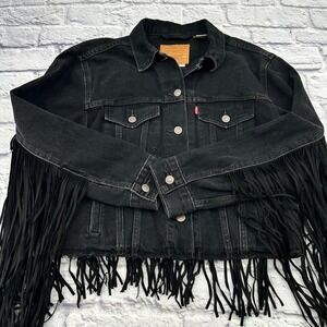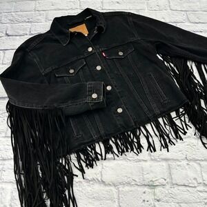 Levis Womens Ex-Boyfriend Trucker Jacket Black Denim Fringe Western Size S