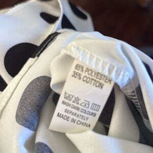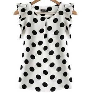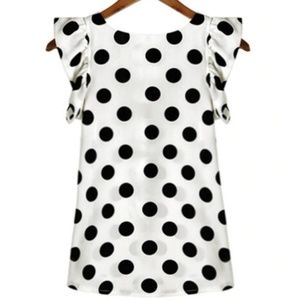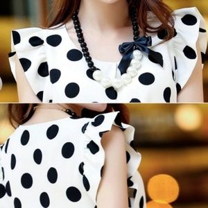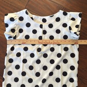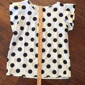 Used good condition. Cute black and white large Polka Dot blouse with ruffled sleeves. Simply gorgeous. Dress up or down. Size S. Measurements see photos. Cotton polyester blend