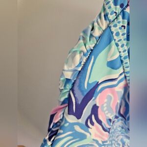 A blue tropical print one piece swimsuit is by Lilly Pulitzer