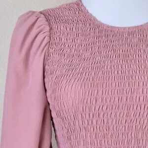 Short sleeve. Smocked stretch bodice. Tiered flowing skirt. Ties behind neck with small keyhole opening. Not lined.