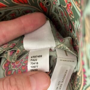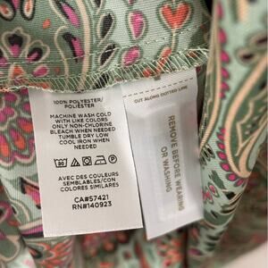 • Pale green color with an allover green, pink, coral, yellow, and black paisley print design
