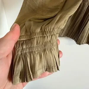 Beautiful Philosophy long sleeve blouse in a soft olive taupe / khaki neutral tone. Features flattering V-neckline, smocked waist, and pleated peplum hem and cuffs. Lightweight flowy fabric with elegant drape — great for work, date night, or dressy casual outfits.