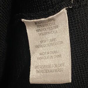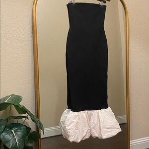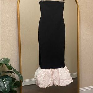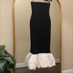 Sophisticated Fitted strapless midi dress w/ a bubble hem in black with an off white ruffled hem. Ideal for elegant events.