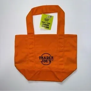 Bright orange canvas tote bag with Trader Joe's logo. Perfect for shopping or everyday use.
