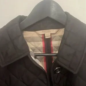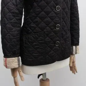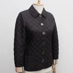 Stylish Burberry quilted jacket. Features classic design with button closure and nova check plaid detail.