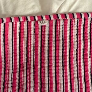 Features: Reversible design, hand-quilted, button front closure with decorative white and pink flower buttons (professionally sewn on), contrasting striped binding trim, long sleeves