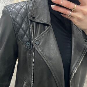 Edgy leather jacket with quilted shoulders. Asymmetrical zip closure. Perfect for a bold look.