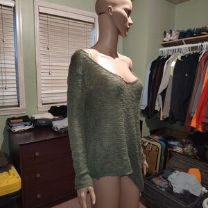 Stylish green sweater. Asymmetrical hem. Off-shoulder design. Perfect for casual wear.