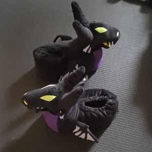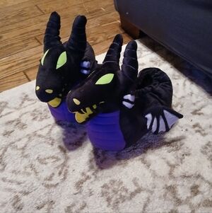 Fun maleficent as the dragon slippers with plush design. Features black and purple colors. Ideal for Disney fans. There is a small hole and a rip where the elastic shows in left slipper there is a photos that show both.For the right slipper one of the wings feel loose, also photos of that. Otherwise these slippers are in good used condition.