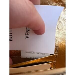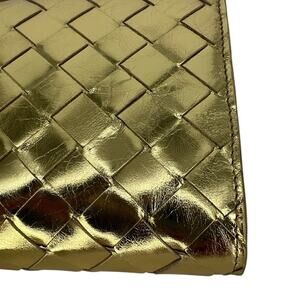 Highly coveted Bottega Veneta Andiamo clutch crafted in signature Intrecciato woven leather with a striking foggy mirror gold finish that delivers understated luxury with modern impact. This refined top-handle clutch features the house’s iconic metallic knot closure and expertly woven leather construction that defines Bottega Veneta’s heritage craftsmanship. The interior includes six card slots and an additional pocket for streamlined organization, while the lambskin lining enhances the luxurious feel. The sculptural silhouette transitions seamlessly from evening wear to elevated daytime styling, making it ideal for formal occasions, travel wardrobes, events, or statement everyday luxury. The gold metallic tone pairs effortlessly with neutrals, tailoring, dresses, or occasion wear and aligns with current heritage craftsmanship appreciation, polished minimalist accessories, and statement metallic styling trends. Made in Italy.