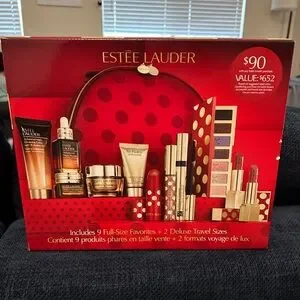 Estee Lauder makeup set with red and gold packaging. Includes full-size and travel-size products. Perfect for gifting.