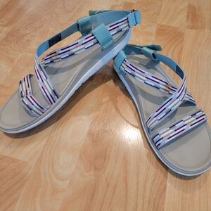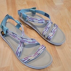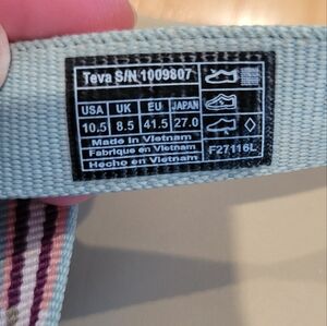 Like new. worn once briefly. size 10.5 womens teva sandals. Great colorway on these sandals. Excellent condition. Score theee teva sandals for a great price!