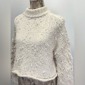 Chic Ivory Milo Chenille distressed crop sweater from Urban Outfitters, size M/L, features a mock neck and raw hem.