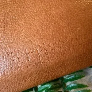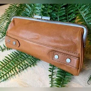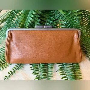 Chic tan leather wallet clutch by Fossil’s Designer Fifty-Four collection with silver clasp frame closure. Ideal for daily use or evening.