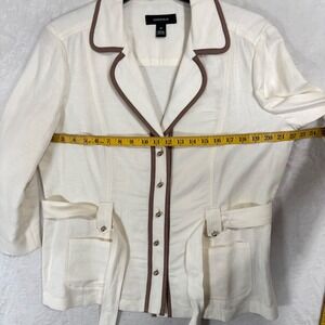 • Jacket: Button front, belted waist tie, notched lapel, soft drape (not super rigid linen texture)