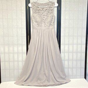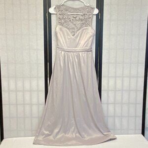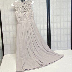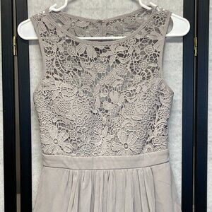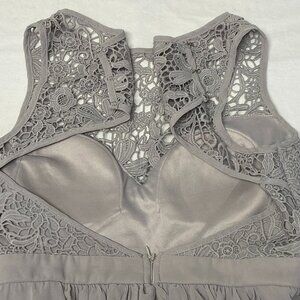 Sleeveless Lace Top Open Back Fit and Flare Formal Dress from Lulus. Lovingly worn – looks in excellent condition. Fit and flare silhouette in silver grey. Heavy crochet lace empire bodice and swingy lined chiffon skirt. Bodice lining forms sweetheart neckline and has built in padded cups. Dress is lined with same soft jersey knit. Crochet like lace bodice, shoulders and sides with open back with hook and eye closure at neck. Empire waistline flares to full swingy long skirt. Chiffon and lining both gathered into band. Invisible zipper and hook closure below band in back. Hits above ankles. Pair with silver heels and dainty jewelry for an effortlessly elegant look.