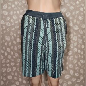 Stylish women's athletic shorts with teal and navy stripes. Comfortable knit design. Perfect for summer activities.