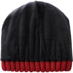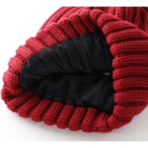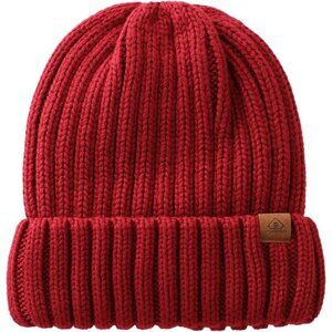 Men Red Ribbed knit Beanie Hat With Cuffed Brim and Small Leather Logo Patch
