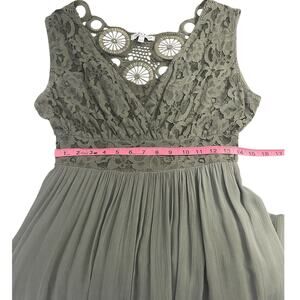 Tempo Paris Lace Crochet Fit & Flare Midi Dress. Beautiful lace front with v-neck, crochet back. Flowy skirt. Lined. Green. Size M/L. Please see photos for measurements.