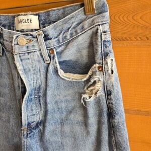 Beautiful lighter wash Agolde jeans with a raw hem and by pocket distressings. These have been dry cleaned after wear, no puckering or spots noted. Distressing was all factory intended with light wear and wash wear.