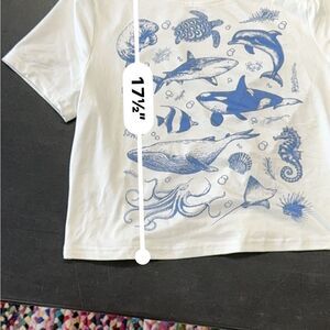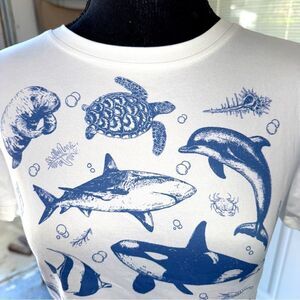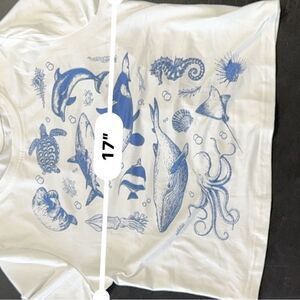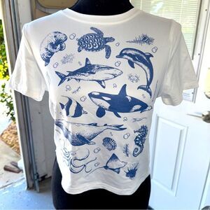 Blue and White Marine Life cropped fitted T-Shirt- size M