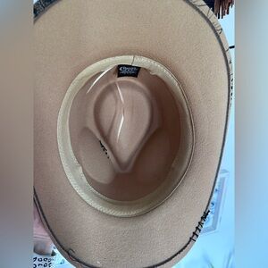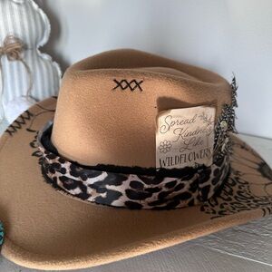 Add a touch of western and boho to your look with this tan beautiful cowboy hat. The leopard band brings a wild flair to any ensemble while the sunflower design adds a bit of a hippie flare. One of kind piece!!! Brand new with tags.
