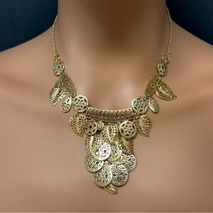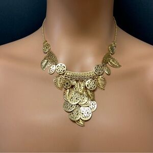 Stylish gold leaf necklace with intricate design. Ideal for elevating any outfit.