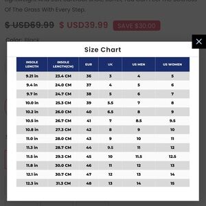 Comfortable cushiony black shoes with durable laces. Ideal for everyday wear. These are listed as European size 43. I believe them to be a size 11 according to the size chart but this exact model is no longer available on their website. Please measure your foot and make sure it will fit within 11 inches
