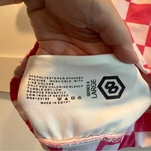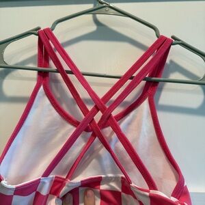 This chic pink checkered sports top is perfect for casual wear or working out. Size medium from Series 8 brand. 95% polyester, 5% spandex. Great condition, no noticeable flaws. Bright pink and white coloring. Cute straps on back.